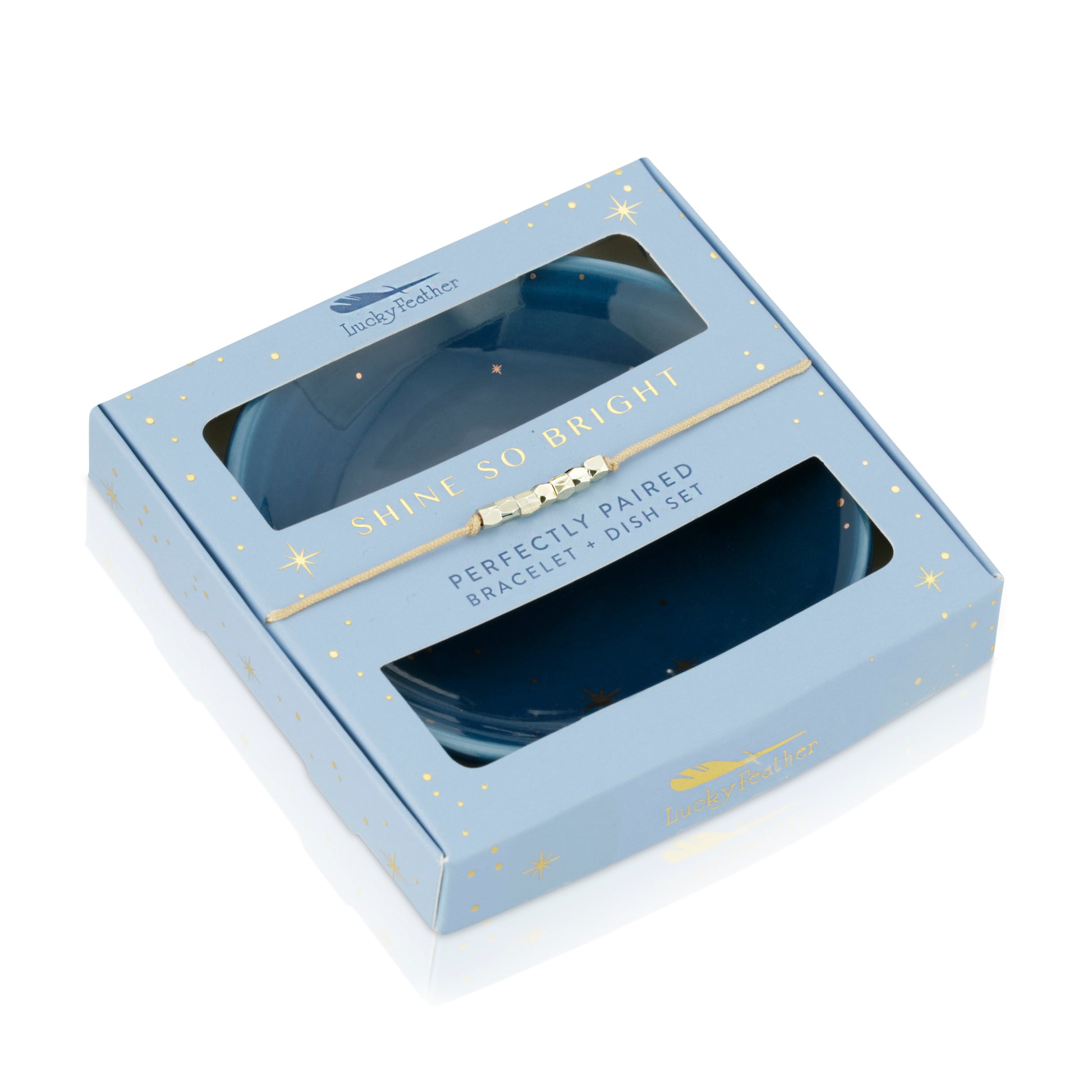 A beautiful bracelet and trinket dish set designed to inspire and delight. Each set includes a delicate bracelet and a ceramic dish with a stylish design and uplifting message- Perfect for holding jewelry, keys, or small treasures.