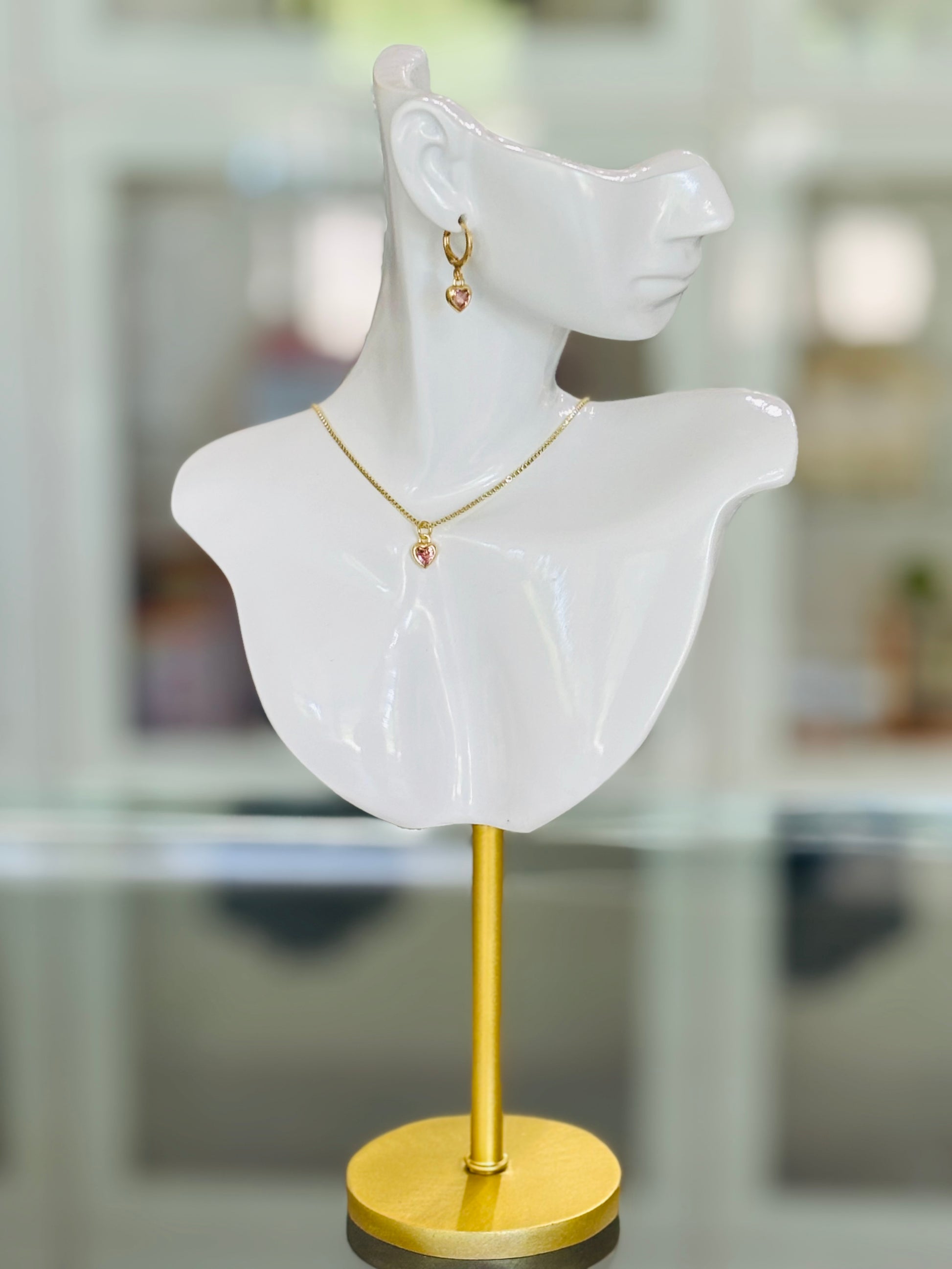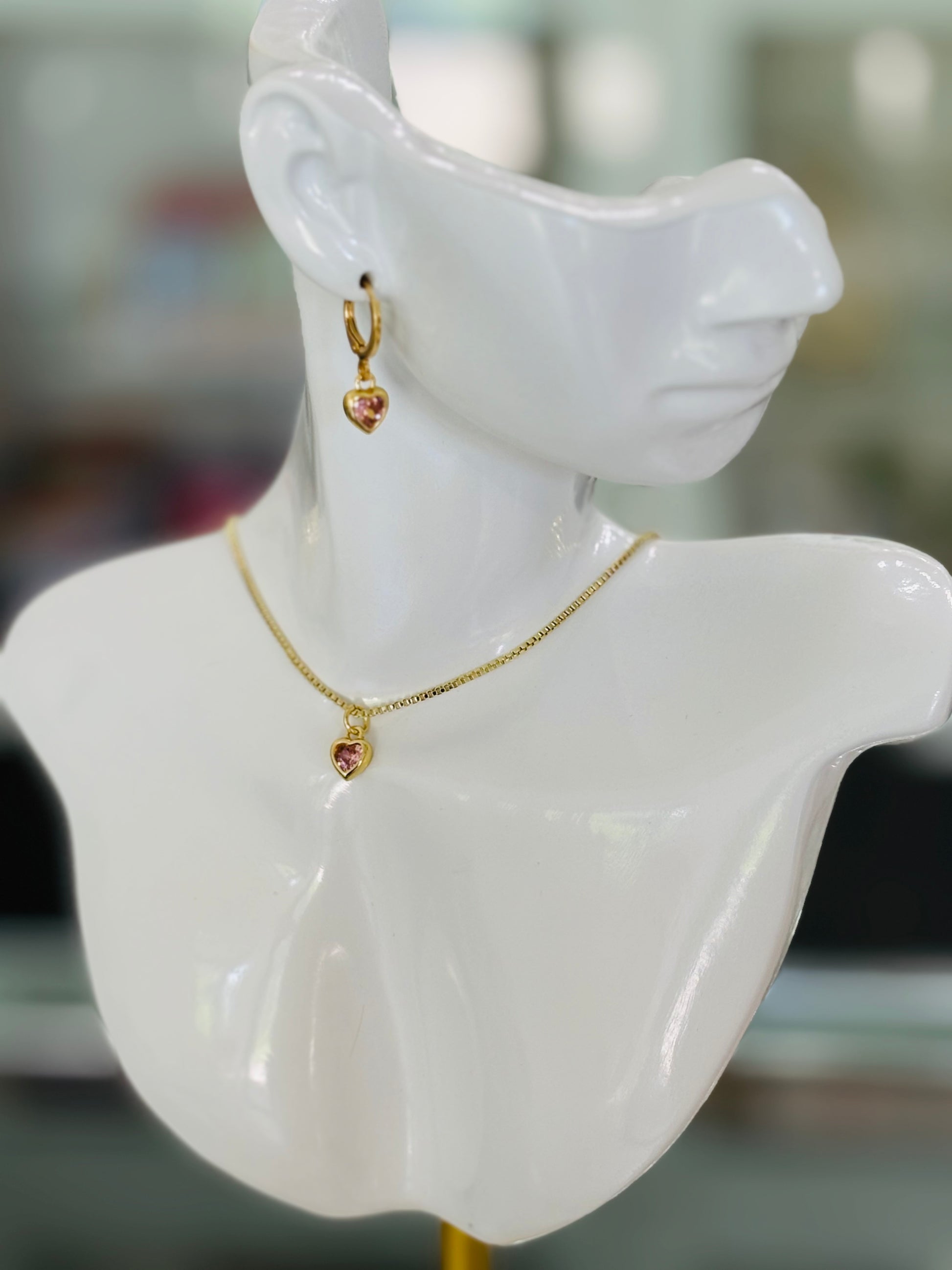 Enhance your jewelry collection with our exquisite Heart Charm Set. This beautiful set includes 18K gold plated huggie earrings and a 16” 14K gold plated box chain, each featuring a matching pink cubic zirconia heart charm. The delicate heart charm, crafted from 18K gold plated pink cubic zirconia, captures the light with every movement, adding a touch of timeless sophistication.